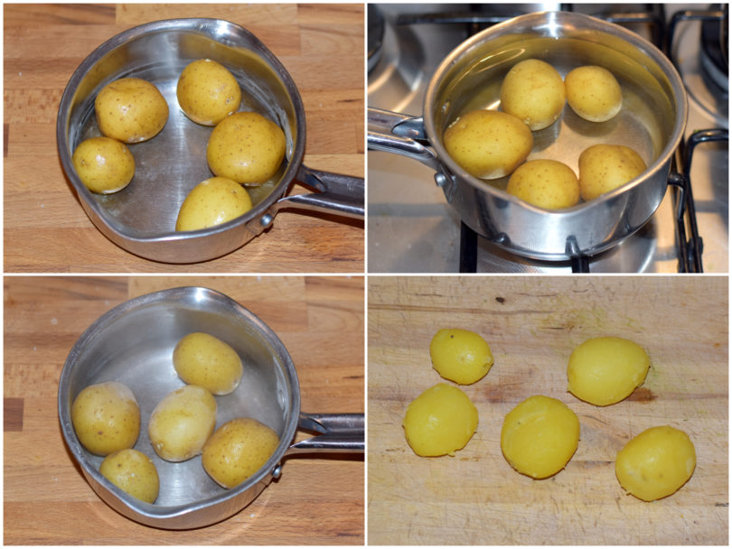 Lavate bene le patate, mettetele in un'ampia pentola piena di acqua fredda, portate a ebollizione e cuocete per circa 30 minuti o fin quando non risulteranno morbide, quindi scolatele e pelatele.