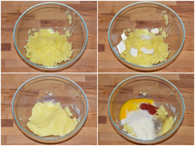 Schiacciate le patate con uno schiacciapatate o un passaverdure, aggiungete il burro a tocchetti e mescolate, quindi incorporate anche sale, pepe, grana, tuorlo e concentrato.