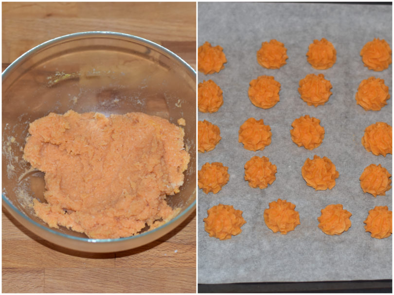 Trasferite il composto in una sac-à-poche con il beccuccio largo a stella e create dei ciuffetti sulla teglia rivestita di carta forno.
