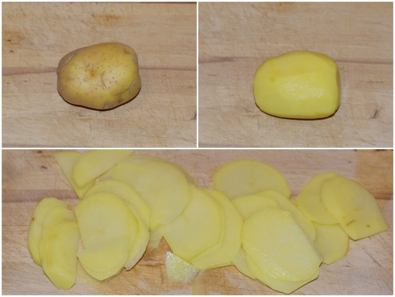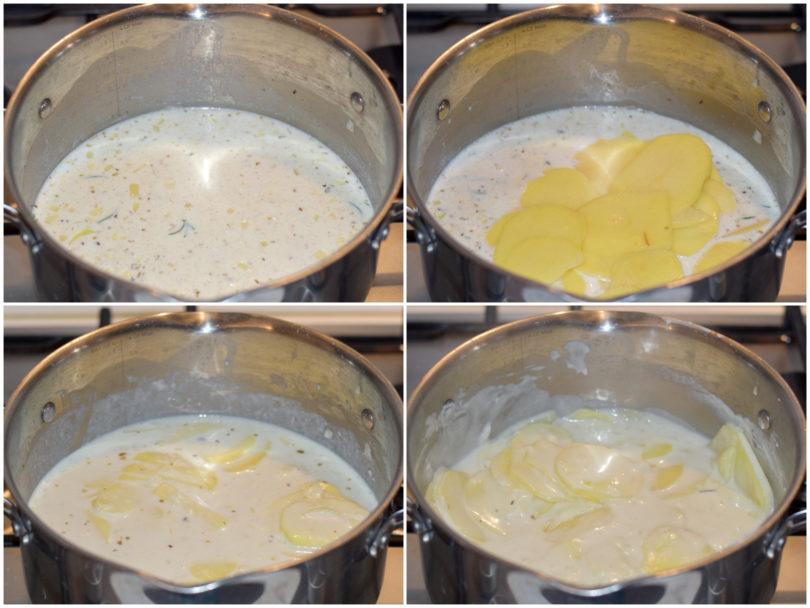Mondate le patate e tagliatele a fettine molto sottili con la mandolina, aggiungetele nella casseruola e lasciate cuocere per circa 10-15 minuti, mescolando: le patate dovranno iniziare ad ammorbidirsi, senza iniziare a rompersi.