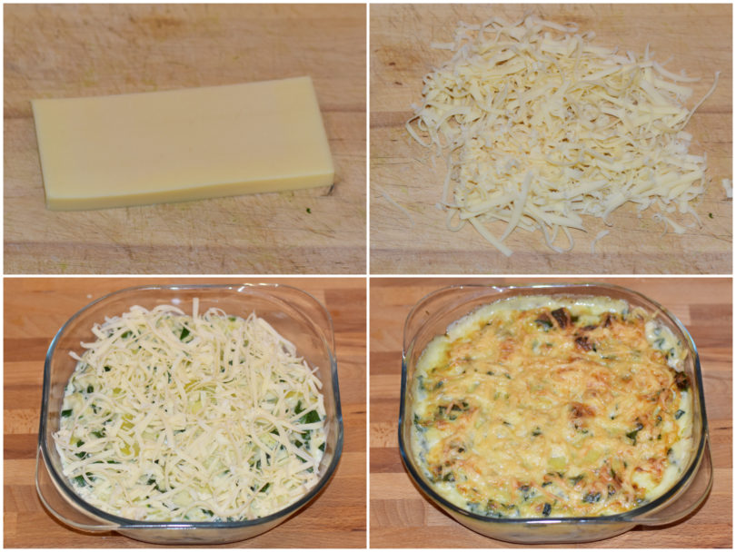 Trasferite il tutto in una teglia imburrata, livellate la superficie, cospargete con il formaggio grattugiato e cuocete fino a doratura (circa 20 minuti) in forno ventilato preriscaldato a 180°C.
