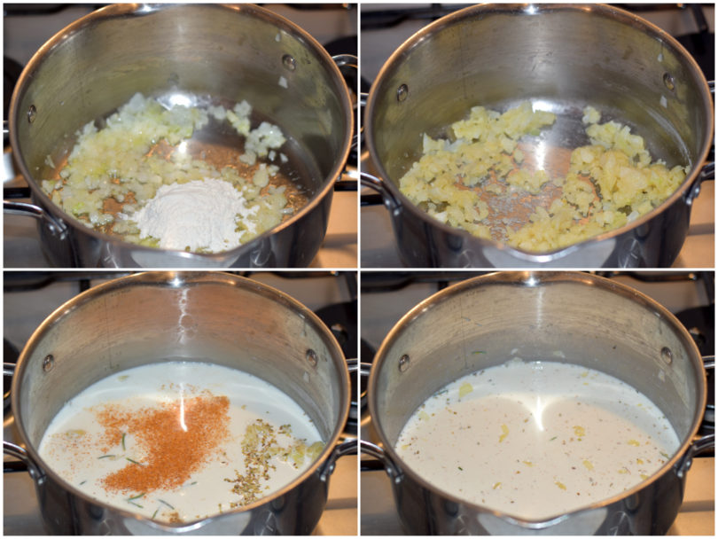 Unite anche la farina e lasciatela tostare nel condimento, quindi incorporate anche latte, panna, spezie (rosmarino, pepe, origano, paprica, noce moscata) e sale e portate a ebollizione.