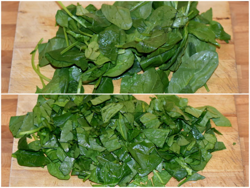 Nel frattempo mondate gli spinaci, spezzettandoli se le foglie sono molto grandi, poi aggiungeteli al resto e lasciate cuocere per altri 5 minuti, finché la salsa non si sarà addensata per bene.