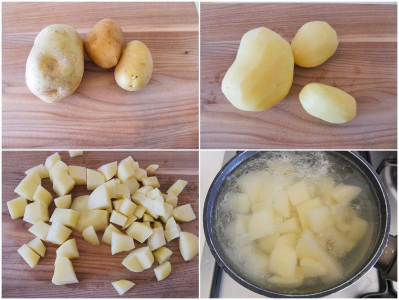 Innanzitutto pelate le patate, lavatele, tagliatele a cubetti non troppo piccoli e lessatele per 8-10 minuti, in modo che si inizino ad ammorbidire leggermente, senza arrivare a cuocersi (devono restare più o meno a metà cottura).