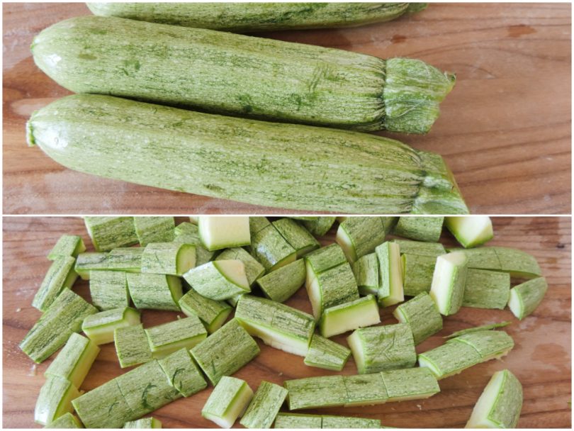 Nel frattempo che si cuociono le patate, potete lavate e mnodare le zucchine e tagliare anche queste a cubetti, all'incirca delle stesse dimensioni delle patate.