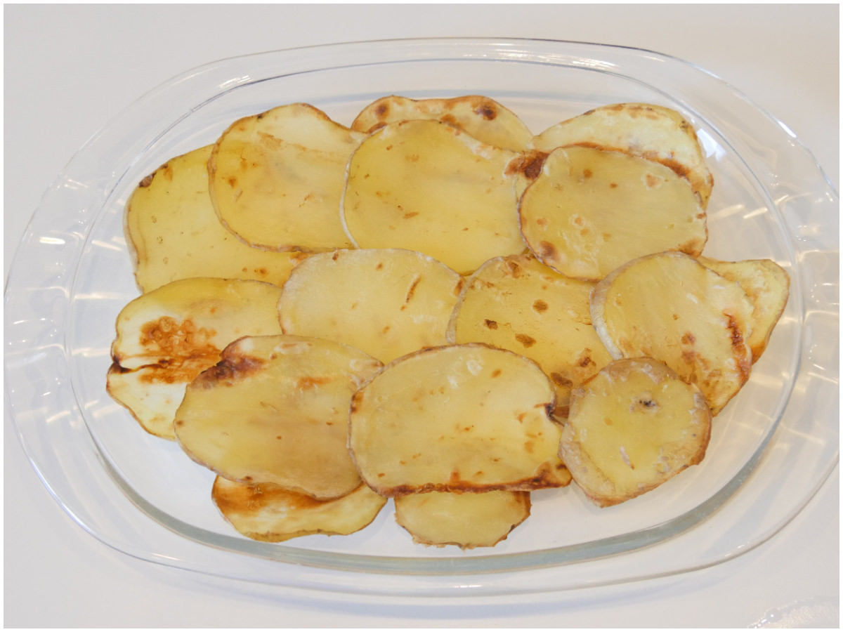 Lavate molto bene le patate sotto acqua corrente, senza sbucciarle, quindi asciugatele e tagliatele a fettine sottili (massimo 1 cm di spessore, non di più) e mettetele in una ciotola con l'acqua per 30 minuti.