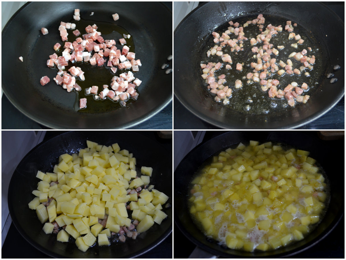 Innanzitutto lavate bene le patate sotto acqua corrente, pelatele e tagliatele a cubetti piccoli.