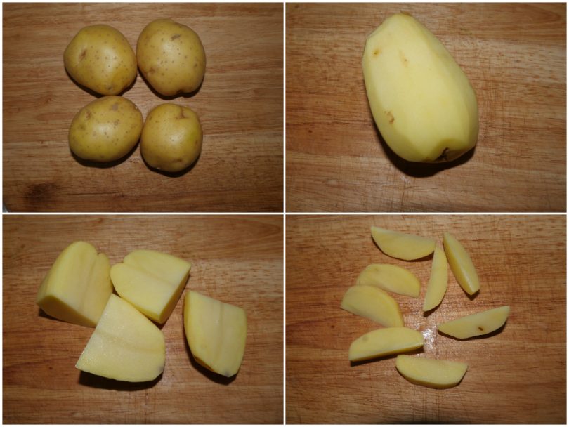 Innanzitutto pelate le patate, lavatele e tagliatele a spicchi (non troppo sottili, direi circa 1 cm).