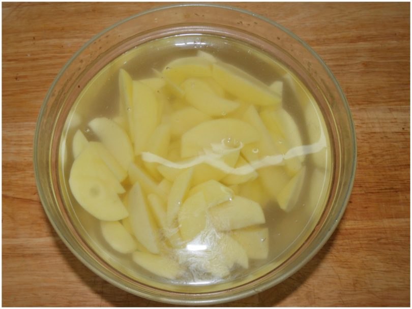 Mettetele in una ciotola, coprite con abbondante acqua fredda e lasciate riposare per almeno 30 minuti (in questo modo scaricheranno amido, che impedirebbe di farle venire belle croccantine, ma allo stesso tempo non si ossideranno).