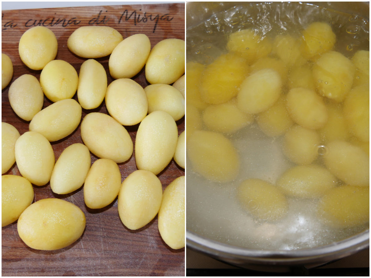 Innanzitutto lavate bene le patate (specialmente se sono con la buccia) e lessatele per circa 10 minuti in acqua salata, quindi scolatele.