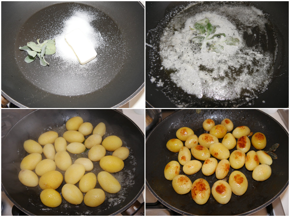 Senza fare raffreddare le patate, fate sciogliere burro e zucchero in una padella antiaderente, insieme alla salvia, mescolando.