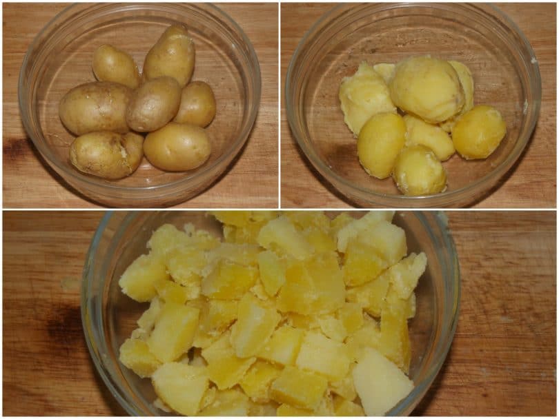 Innanzitutto lavate bene le patate, mettetele in una pentola ampia con acqua fredda, portate a ebollizione e lasciate cuocere per circa 30 minuti o finché non risulteranno morbide, quindi scolatele, pelatele e tagliatele a tocchetti.