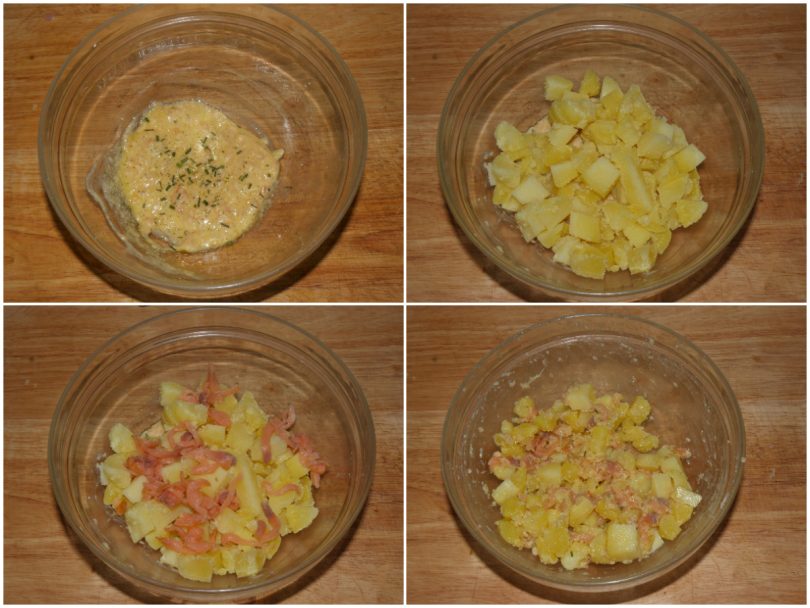 Incorporate erba cipollina, sale e pepe nella salsa, quindi unite le patate e il salmone e mescolate.