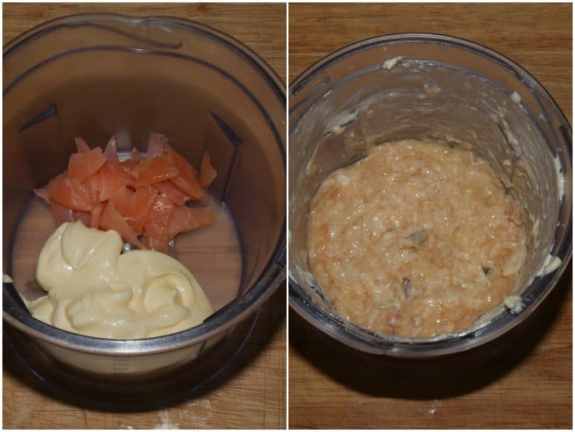 Nel frattempo preparate il condimento: unite maionese e salmone in un mixer e frullate grossolanamente.