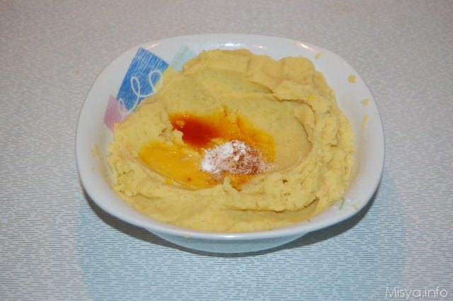 Fate sciogliere lo zafferano nel vino e aggiungetelo alla purea in sieme al tuorlo, al lievito, al sale e al pepe