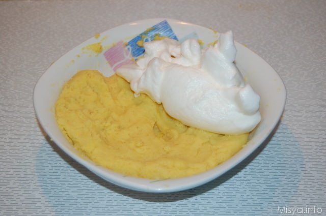 Mescolate tutto e montate gli albumi a neve e fateli incorporare mescolando con un cucchiaio di legno