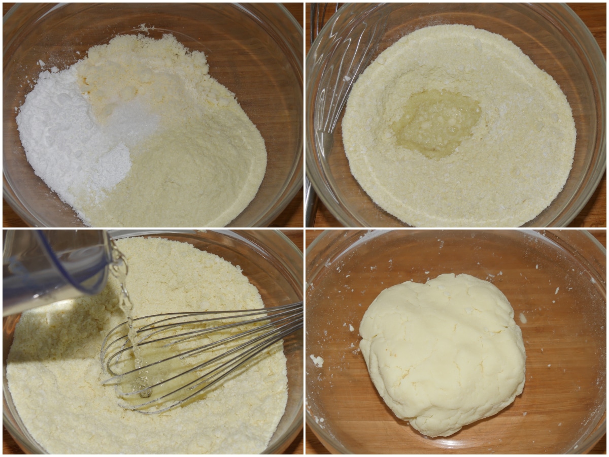 Mettete tutti gli ingredienti secchi (preparato per purè, fecola, grana, sale e lievito) in una ciotola, amalgamate e iniziate a versare l'acqua, mescolando bene, continuando ad aggiungerne fino ad ottenere un composto liscio e morbido, ma non troppo appiccicoso.