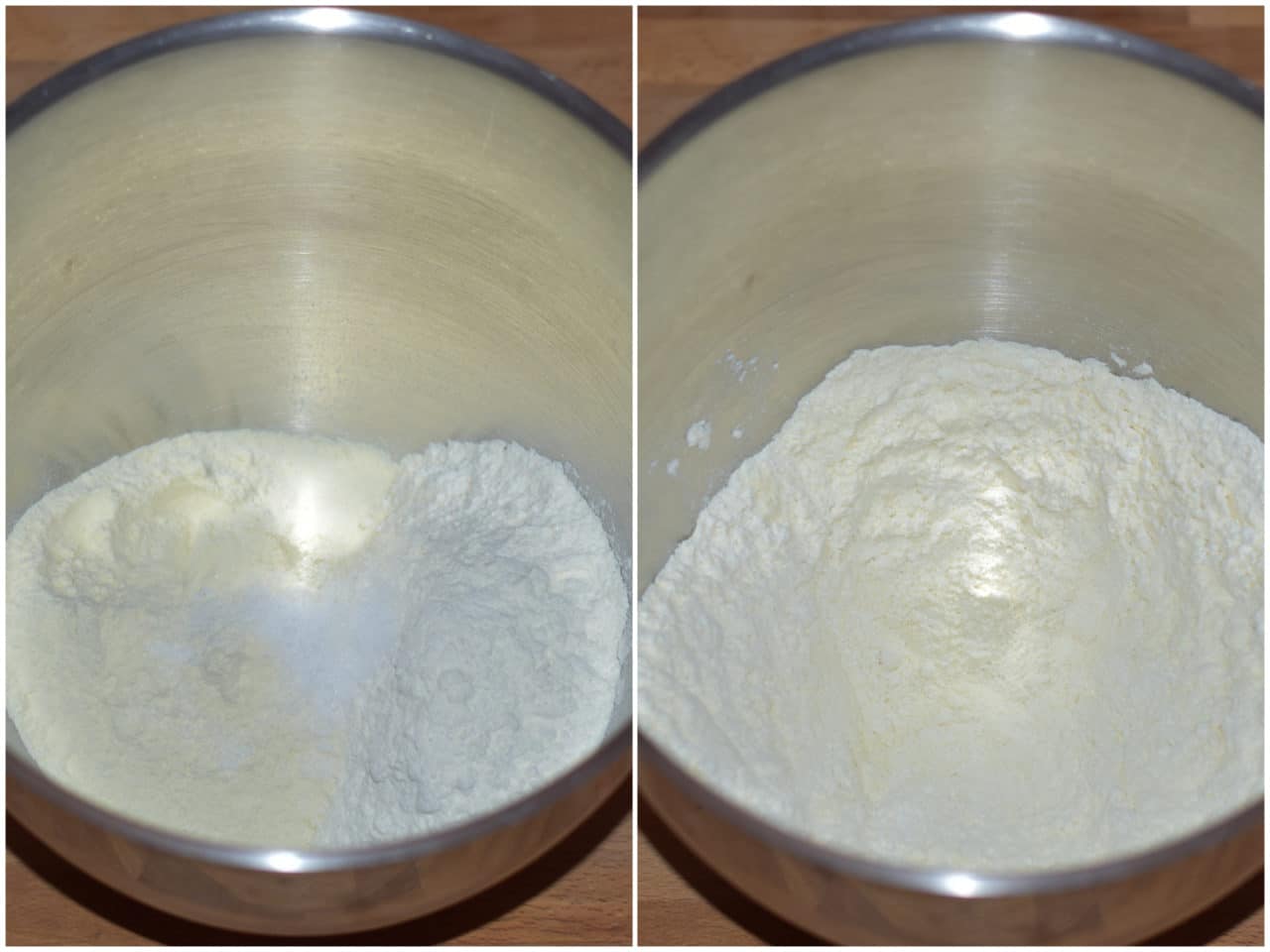 Innanzitutto preparate l'impasto: mettete le farine e il sale in una ciotola e mescolate.