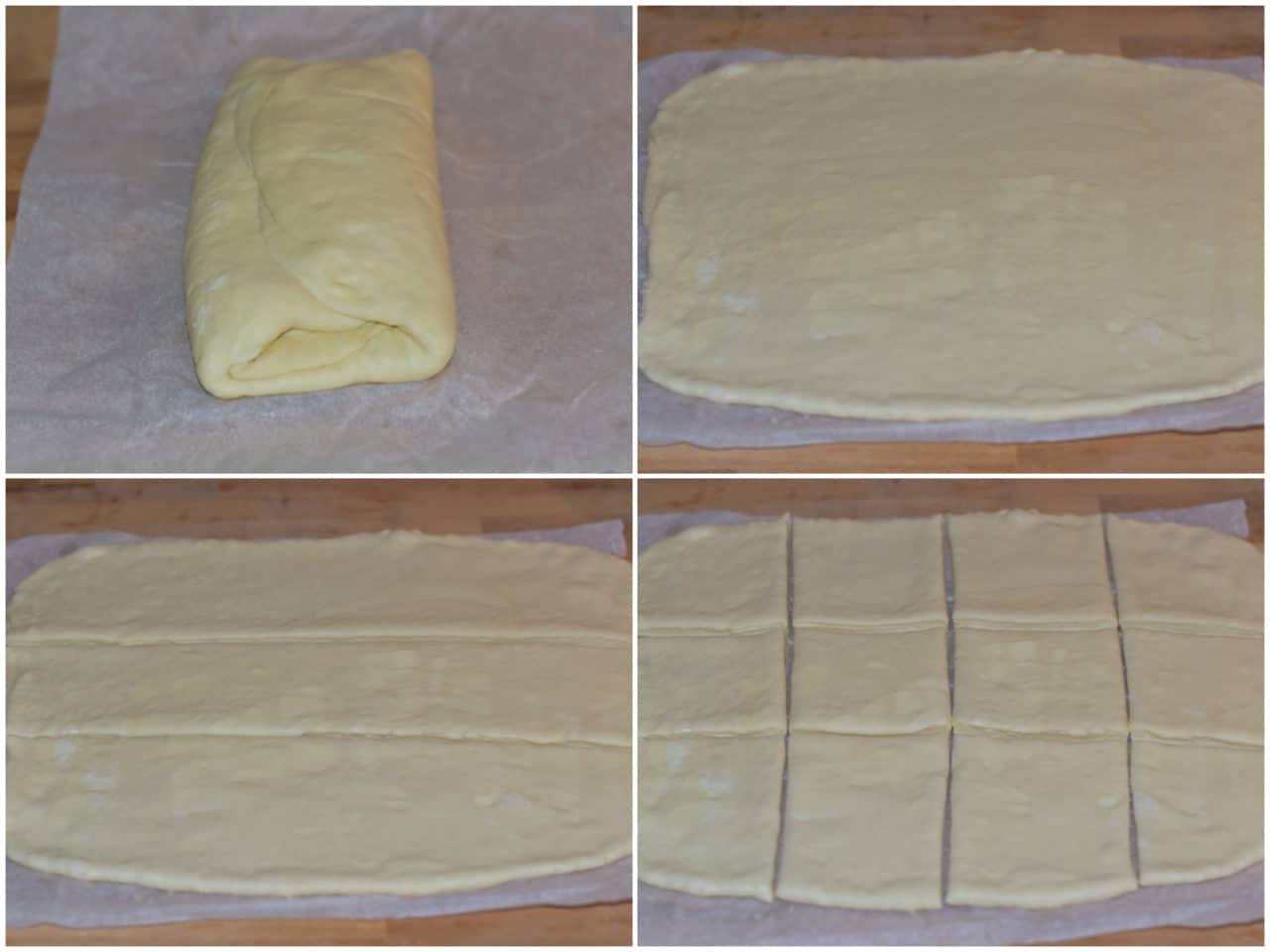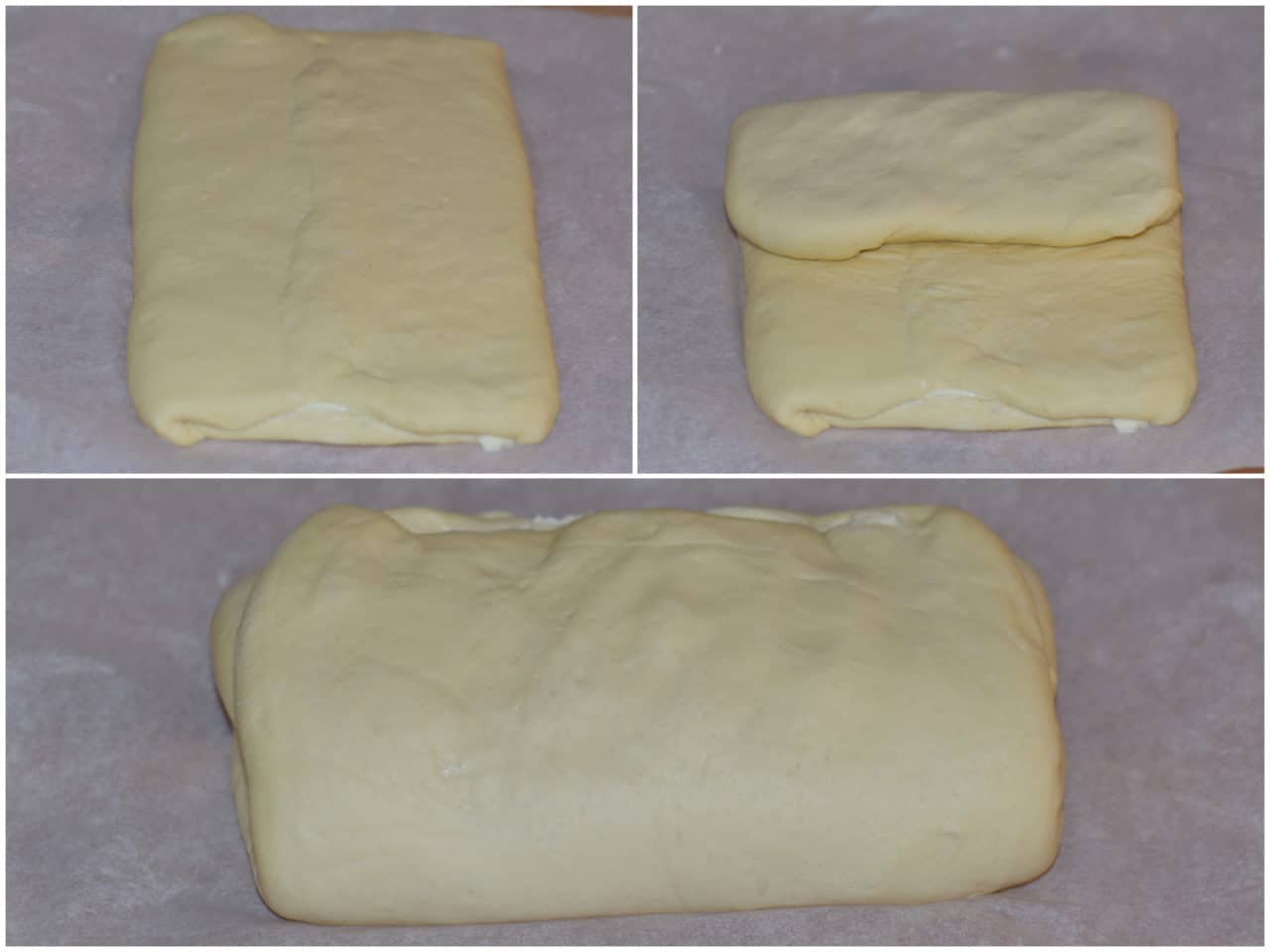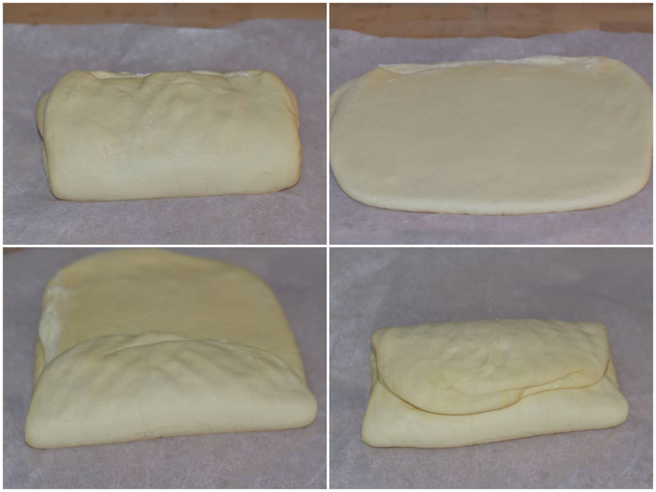 Riprendete l'impasto e ripetete per altre 3 volte: piegate i lembi dal lato corto sul centro, stendete con il matterello e mettete in frigo per 30 minuti, poi di nuovo e di nuovo ancora.