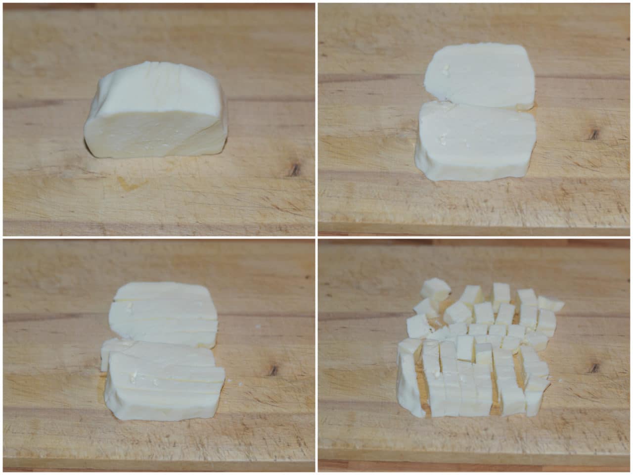Preparate il ripieno, tagliando il formaggio a dadini e il prosciutto a pezzetti.