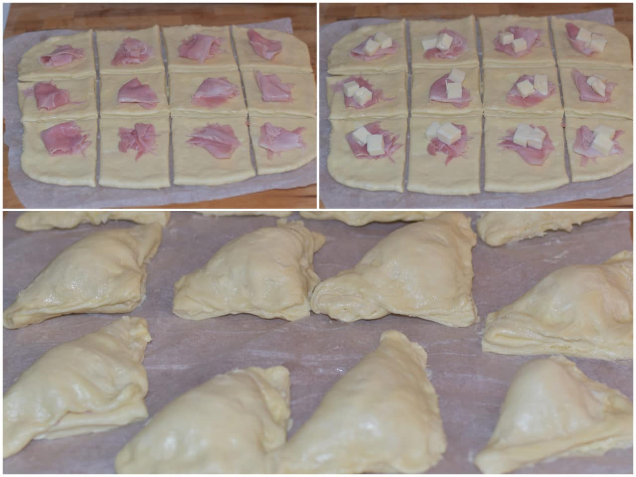 Aggiungete un po' di ripieno al centro dei quadratini e richiudeteli a triangolino portando uno degli angoli su quello opposto, quindi sigillate bene i bordi.