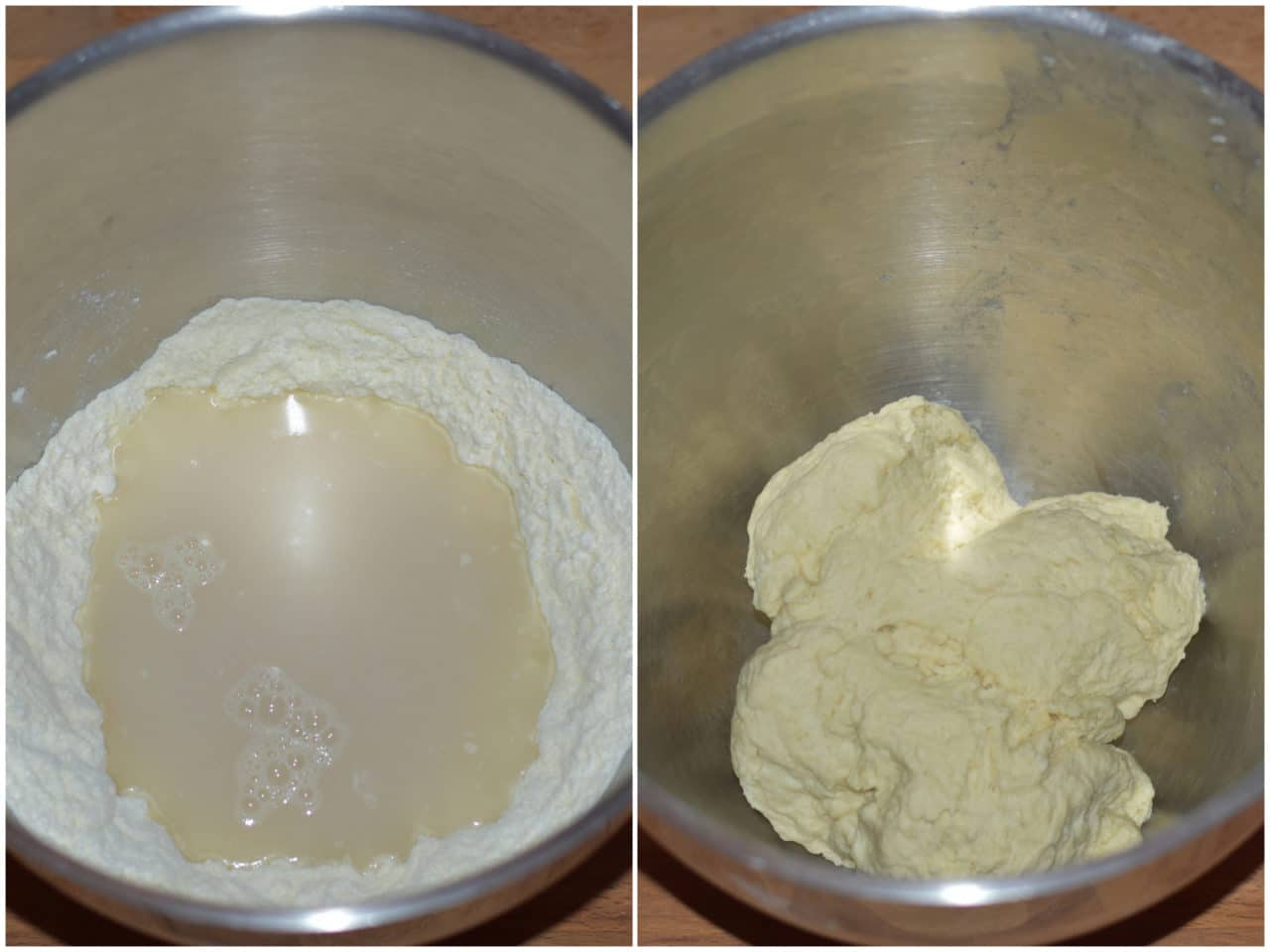 Sciogliete lievito e zucchero nell'acqua appena tiepida, quindi aggiungetelo alle farine e iniziate a impastare.