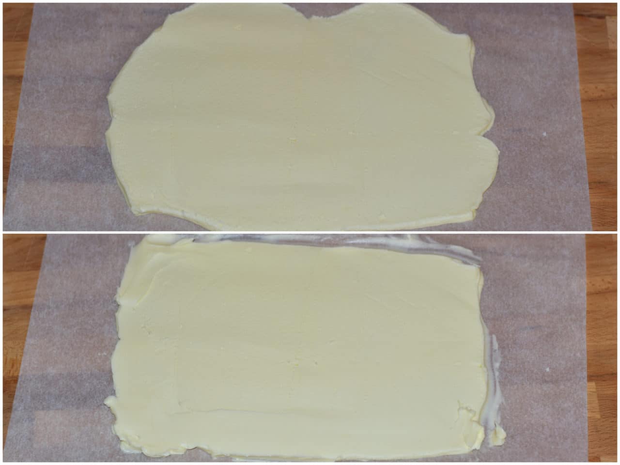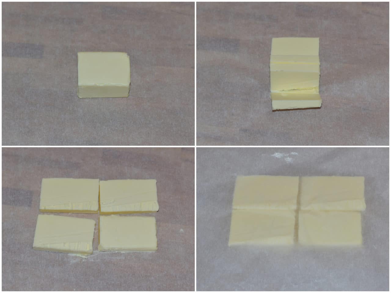 Nel frattempo tagliate il burro in pezzi, disponetelo tra due fogli di carta forno e stendetelo con un matterello fino ad ottenere una sottile sfoglia rettangolare, quindi rimettetela in frigo per almeno 30 minuti.