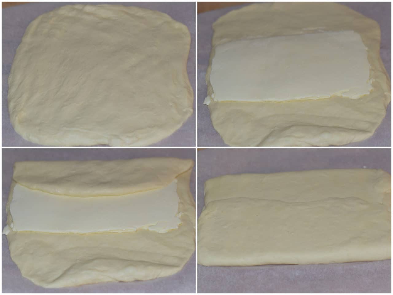 Riprendete l'impasto e stendetelo in una sfoglia rettangolare, disponete al centro la sfoglia di burro e ripiegate i lembi dell'impasto sul burro.