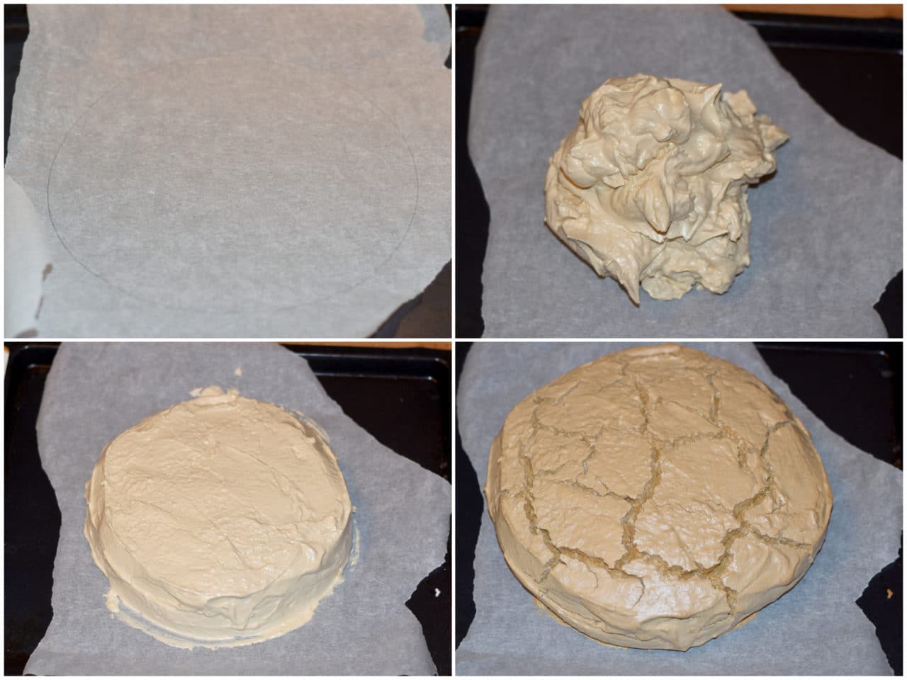 Aiutandovi con una spatola, trasferite la meringa al caffè sulla carta forno, al centro del cerchio, poi livellatela per creare un disco che rimanga entro i confini del cerchio e sia piatto in superficie.