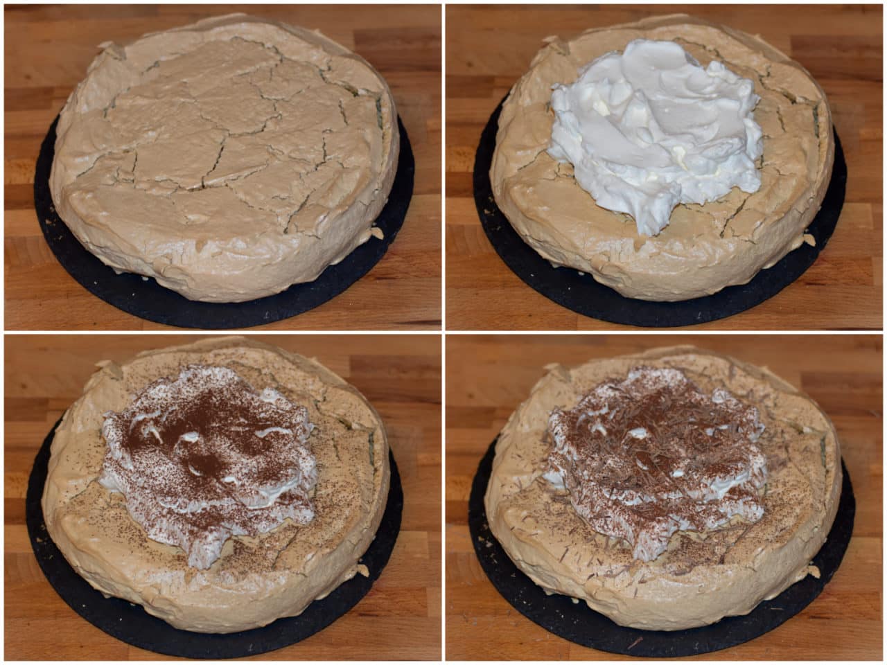 Distribuite la panna al centro della meringa, lasciando i bordi liberi, quindi decorate con il cacao e i riccioli di cioccolato.