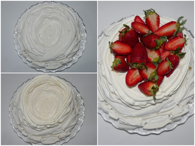 Poco prima di servire posizionare con cura la meringa su un piatto di portata farcire con la panna montata e le fragole o altra frutta fresca, quali frutti rossi o kiwi, tagliare a fette e servire.