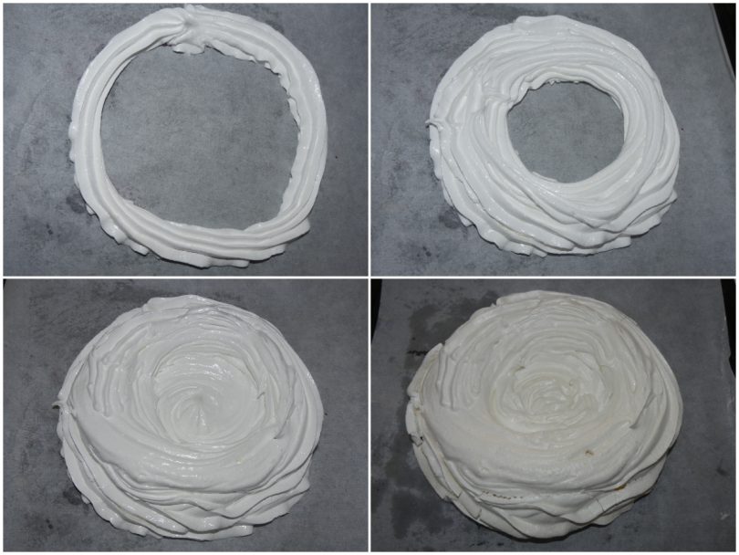 Attaccate un foglio di carta da forno in una teglia. Con l'aiuto di una sac a poche formate un disco e poi fate un giro intorno. Spalmare la meringa su tutta la superficie del cerchio formando tutt'intorno dei bordi rialzati.