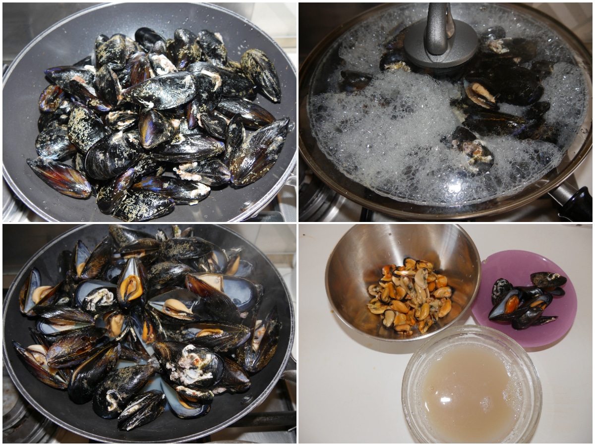 Iniziate pulendo bene le cozze sotto acqua corrente (qui la guida per farlo al meglio), quindi fatele aprire mettendole in un'ampia casseruola con coperchio e cuocendo a fiamma vivace finché non si aprono tutte le valve.