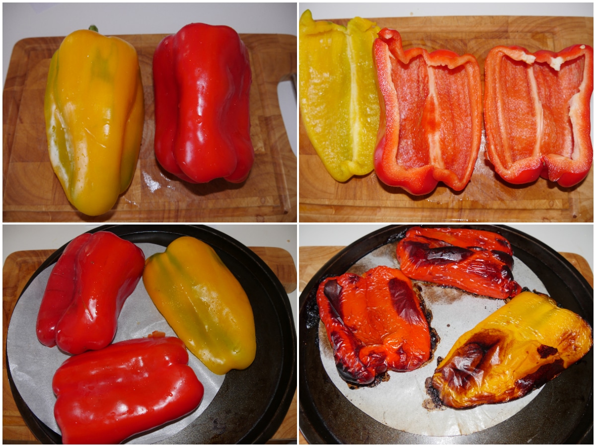 Nel frattempo lavate i peperoni e cuoceteli in forno (ventilato, già caldo) per circa 20 minuti a 200°C, in modo che si abbrustoliscano e li possiate spellare agevolmente.