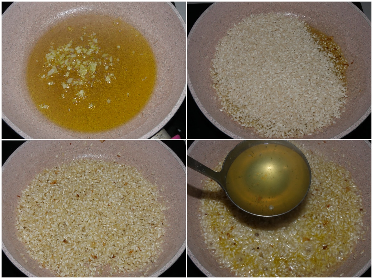 Fate appassire il cipollotto con olio abbondante in una casseruola, unite il riso e fatelo tostare nel condimento, quindi iniziate la cottura aggiungendo il brodo poco per volta.