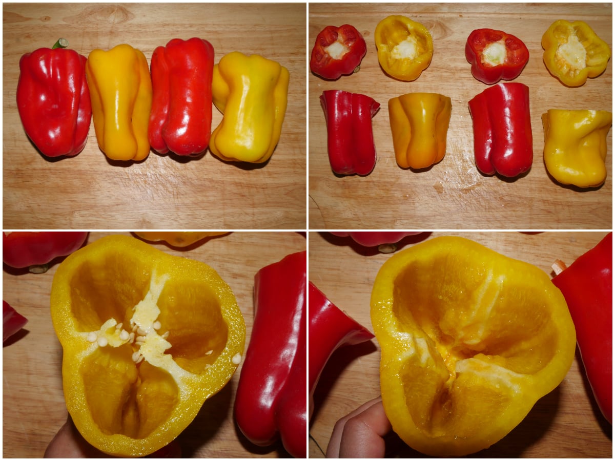 Lavate i peperoni, tagliate via la calotta (conservate la calotta da parte per decorare i piatti) con i semi ed eliminate i filamenti bianchi e i semini rimasti.