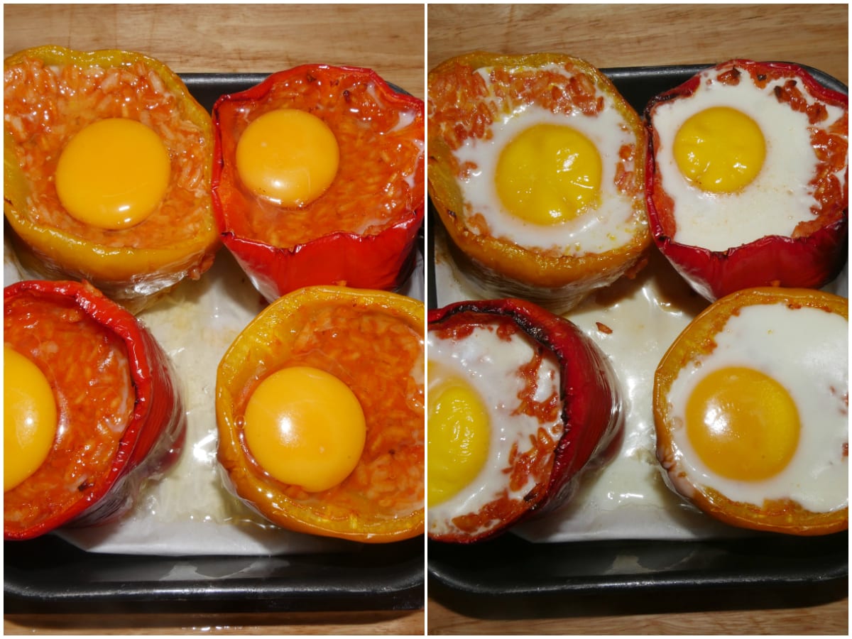 Riprendete i peperoni, rompete un uovo su ognuno di essi disponendolo proprio sul riso, coprite la pirofila con carta di alluminio e lasciate cuocere per altri 10 minuti.