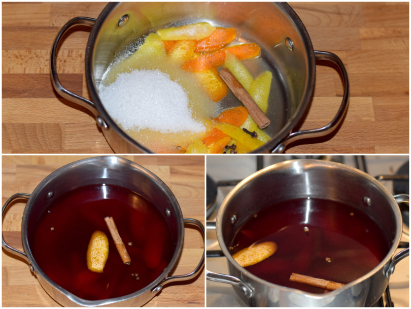 Innanzitutto mettete in una casseruola bucce di agrumi (cercate di prendere solo la parte superficiale, senza quella bianca), cannella, zucchero, chiodi di garofano e vino e iniziate a scaldare.