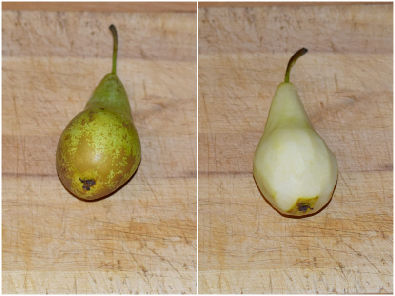 Pelate le pere lasciandole intere, con tanto di gambo in cima, quindi tuffatele nella casseruola.