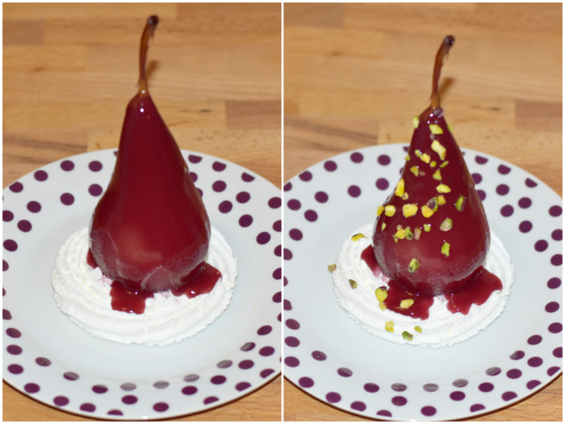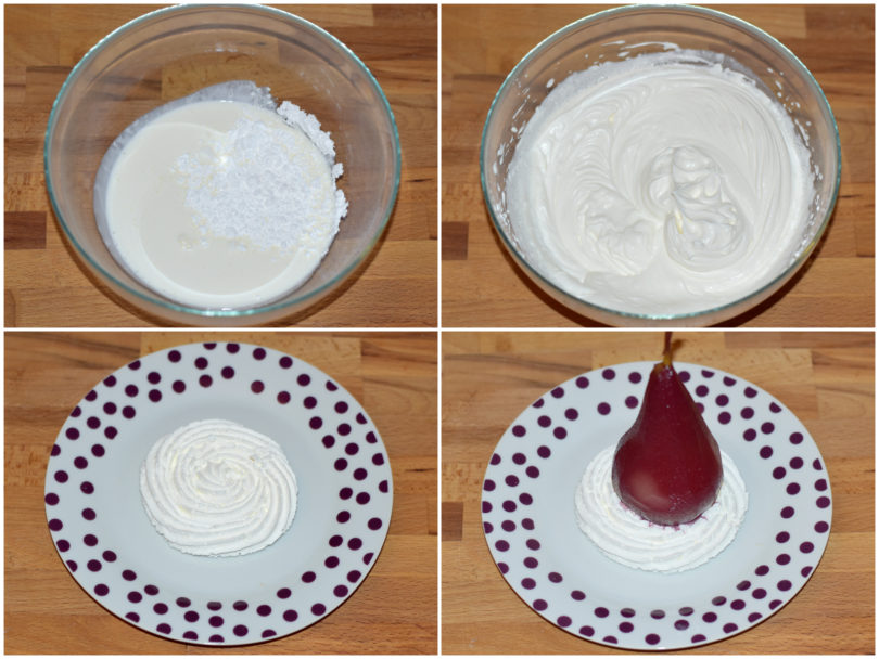 Create un piccolo letto di panna su di un piatto con una sac-à-poche, disponete al centro la pera.