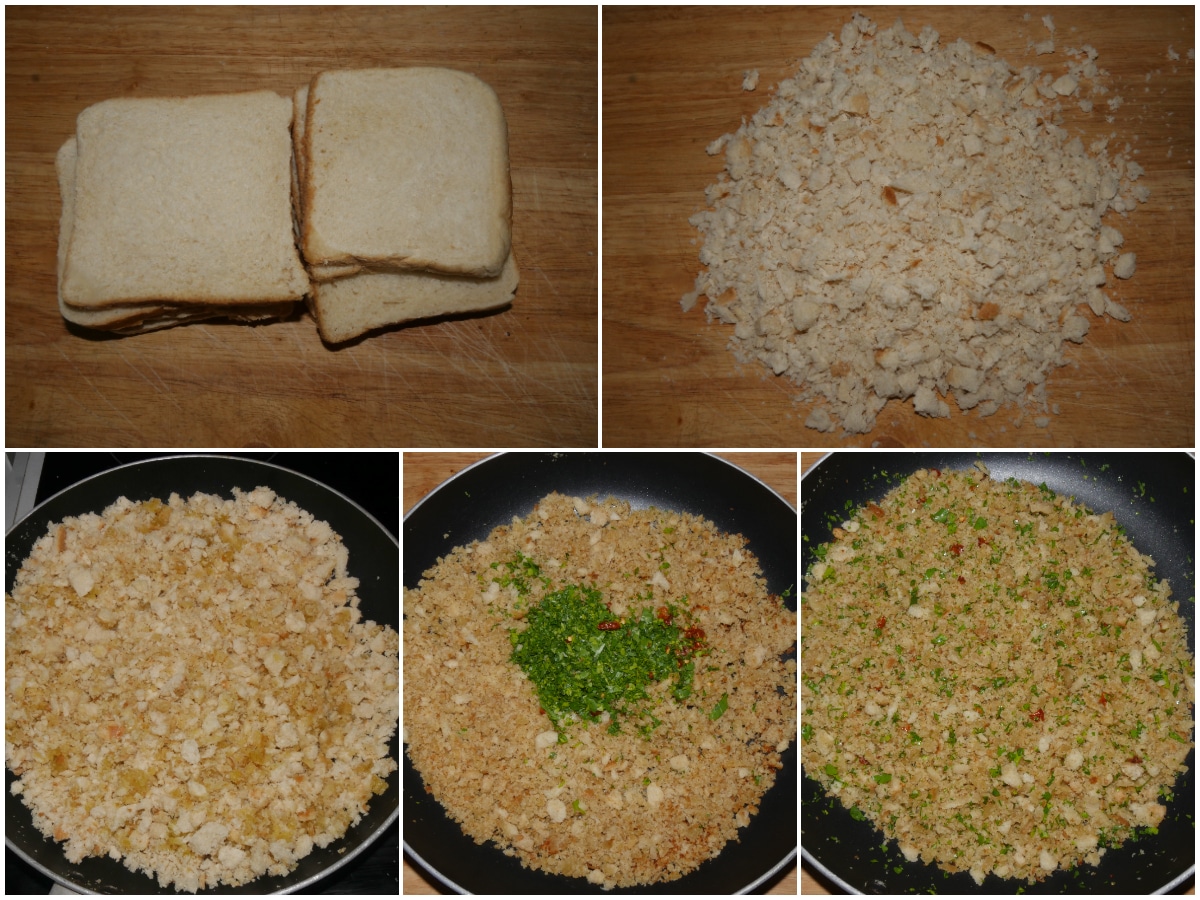 Innanzitutto preparate la panatura: sbriciolate grossolanamente il pane e fatelo tostare in un'ampia padella antiaderente con aglio, prezzemolo e peperoncino tritati e un po' di olio.