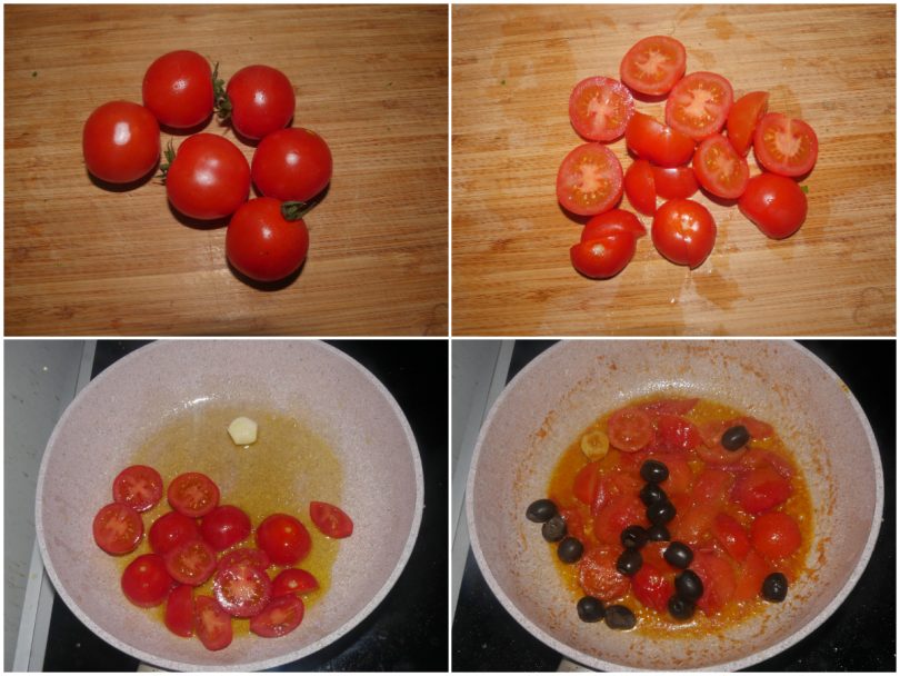 Lavate e tagliate i pomodorini a metà poi fateli cuocere in padella con olio e aglio per una decina di minuti, poi unite le olive nere denocciolate e salate.