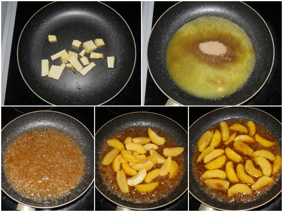 Fate sciogliere il burro in una padella antiaderente, quando inizierà a sfrigolare leggermente aggiungete lo zucchero e aspettate che si sciolga, quindi unite le pesche e gli aromi e mescolate delicatamente, in modo da farle caramellare in maniera uniforme: basteranno circa 5 minuti di cottura.