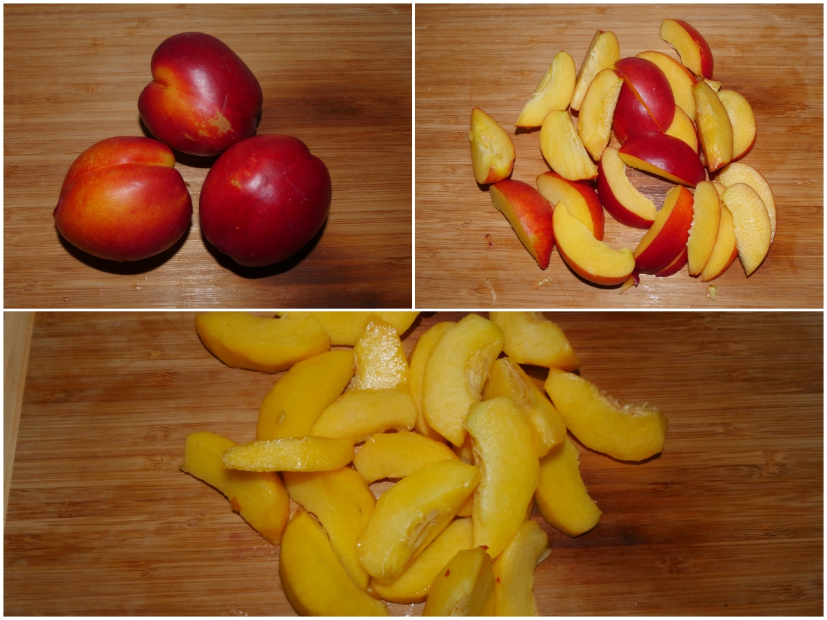 Sbucciate le pesche e tagliatele a spicchi non troppo spessi (circa 1-2 cm).