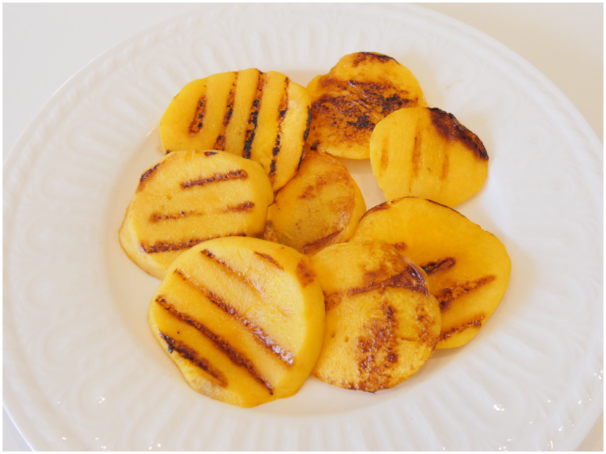 Le pesche grigliate sono pronte, servitele calde, tiepide o anche fredde, come preferite.