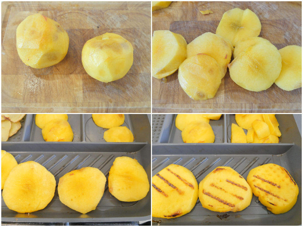 Sbucciate le pesche e tagliatele a fette non troppo sottili (o si romperanno troppo facilmente), eliminando il nocciolo, quindi fate scaldare per bene una bistecchiera e cuocetele a fiamma alta per 2-3 minuti per lato, in modo da farle colorire senza cuocerle troppo.
