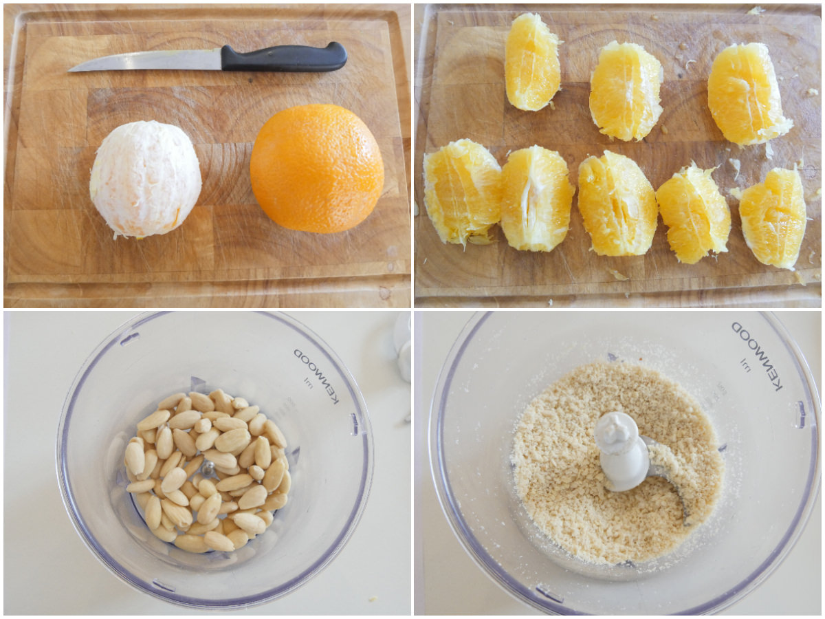 Lavate bene il basilico, asciugatelo, eliminate i gambi e frullatelo insieme alle mandorle e alle arance.