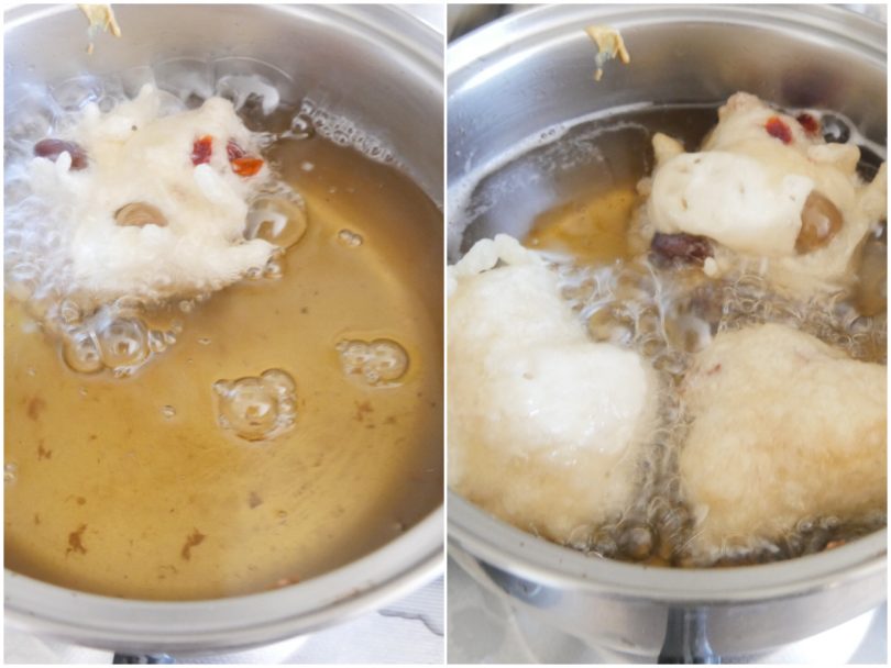 Fate scaldare l'olio in una casseruola e cuocete la pastella a cucchiaiate, girandole per farle dorare uniformemente, quindi scolatele su carta assorbente da cucina.
