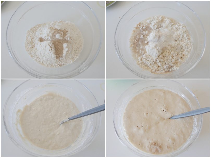 Mettete farina, lievito e zucchero in una ciotola, aggiungete l'acqua e iniziate a mescolare con una forchetta, quindi unite anche il sale e amalgamate fino ad ottenere una pastella omogenea.