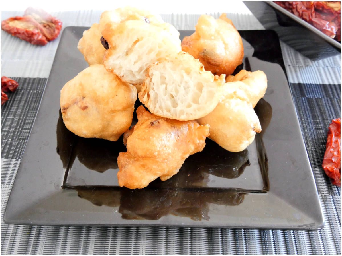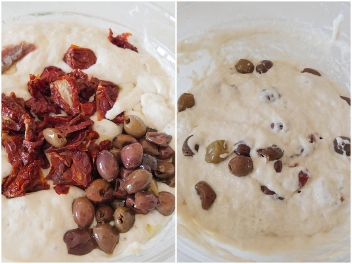 Riprendete la pastella e incorporate pomodori secchi a pezzetti, olive denocciolate e acciughe sminuzzate.